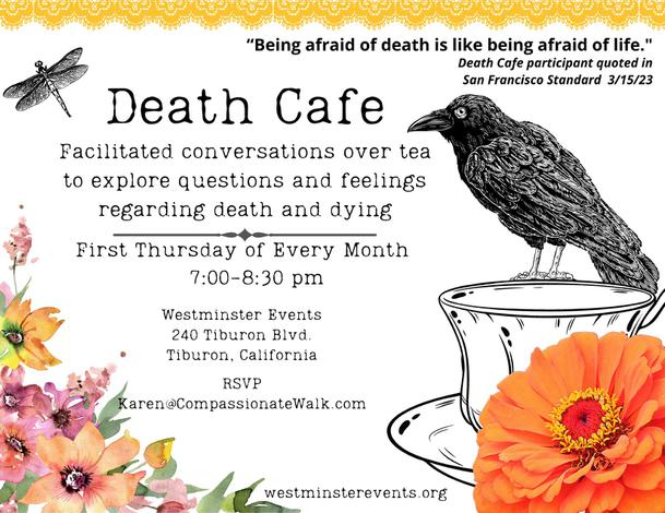 We invite you to gather on the 1st Thursday of every month at our death cafe -- a safe place to embrace mortality and our shared human experience.
