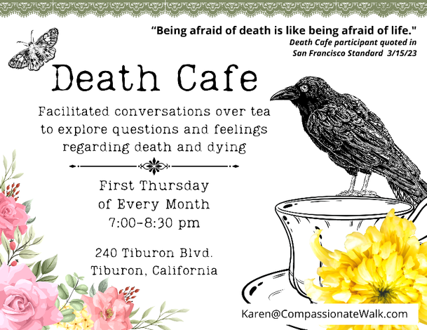 We invite you to gather on the 1st Thursday of every month at our death cafe -- a safe place to embrace mortality and our shared human experience.