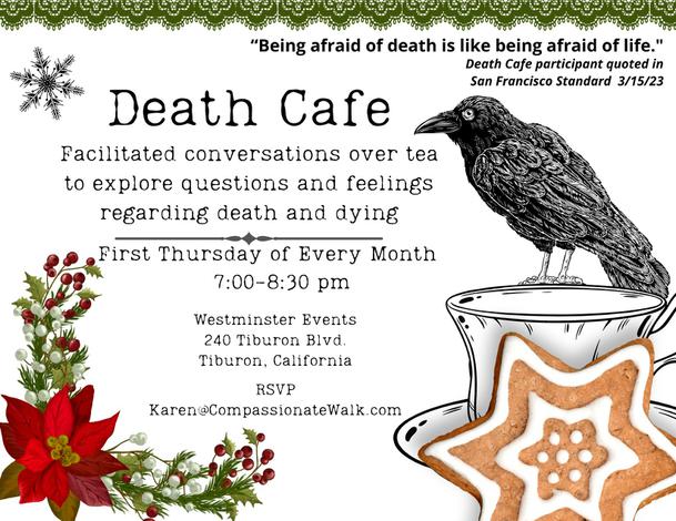 We invite you to gather on the 1st Thursday of every month at our death cafe -- a safe place to embrace mortality and our shared human experience.