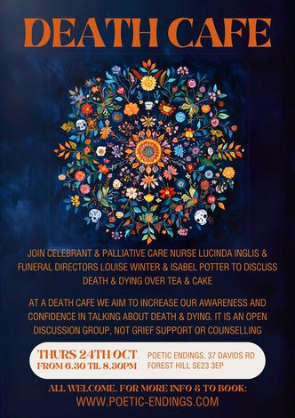 Join funeral directors Louise Winter & Isabel Potter to discuss death & dying over tea & cake, in the beautiful setting of Poetic Endings' funeral home in Forest Hill, SE London.