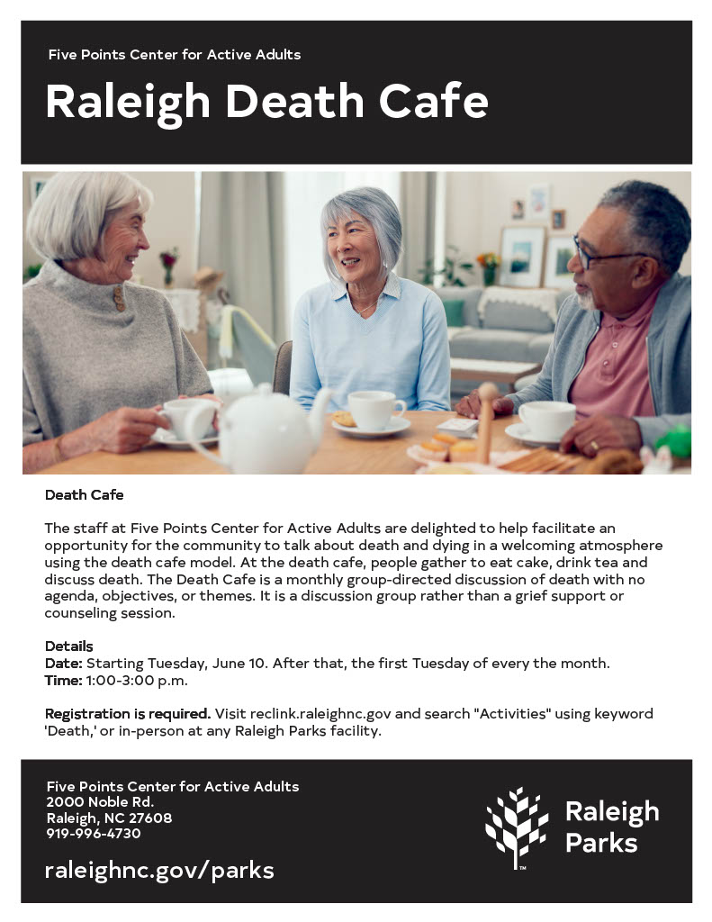 Five Points Center for Active Adults is a City of Raleigh 50+ community center that is excited to host a death cafe. We want to invite the community to openly disscuss death and dying, and we want them to know that their community welcomes it.