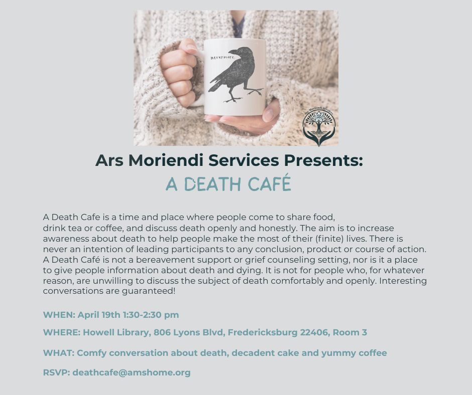 drink tea or coffee, and discuss death openly and honestly. The aim is to increase awareness about death to help people make the most of their (finite) lives. There is never an intention of leading participants to any conclusion, product or course of action. A Death Café is not a bereavement support or grief counseling setting, nor is it a place to give people information about death and dying. It is not for people who, for whatever reason, are unwilling to discuss the subject of death comfortably and openly. Interesting conversations are guaranteed!