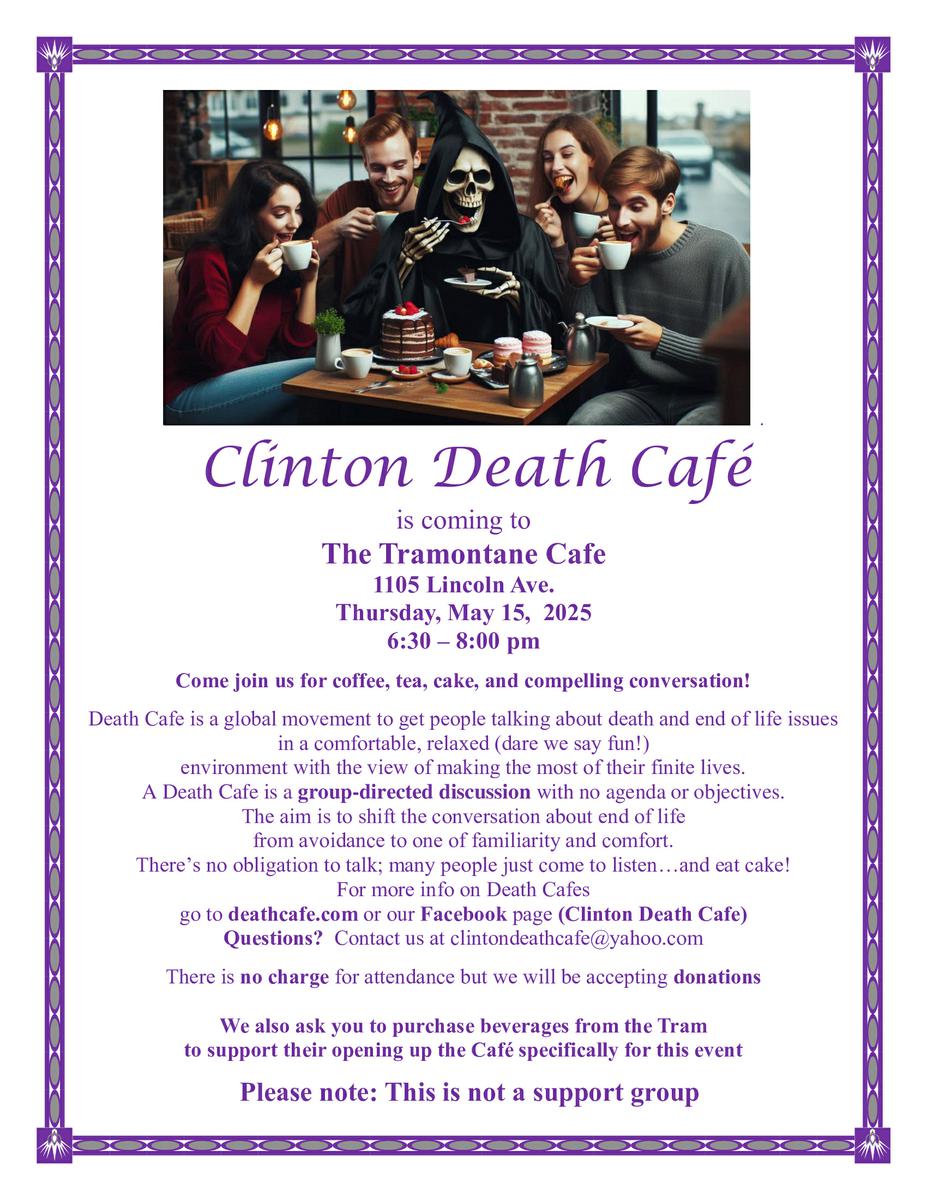 Our aim at the Clinton Death Café is to provide a friendly, relaxed, and hopefully, fun environment for people to talk about and explore issues surrounding death and end of life, without an agenda, judgement, or criticism. There’s no obligation to speak, you can listen to what others have to say while you sit and enjoy cake, coffee and tea!