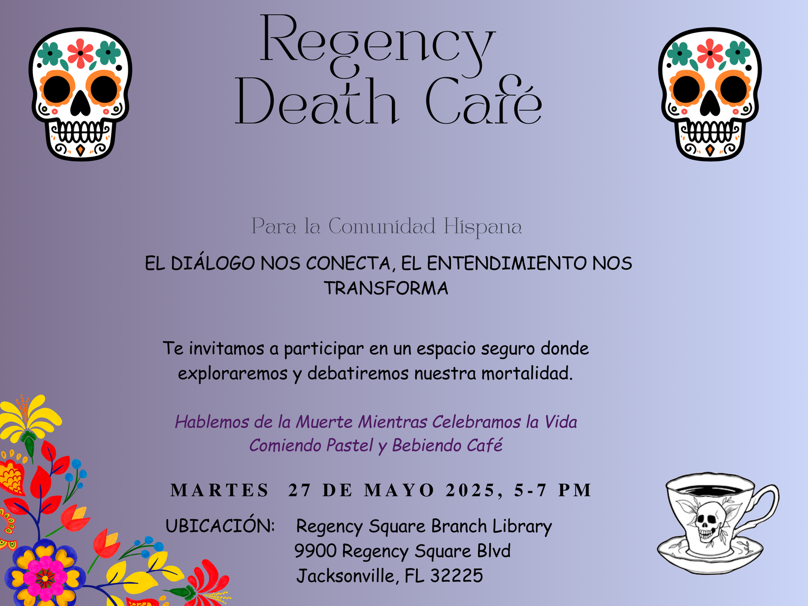 Un “Death Café” es un espacio donde se tienen conversaciones abiertas y respetuosas sobre la muerte sin agendas, objetivos, ni temas específicos. Comenzaremos presentándonos y compartiendo lo que nos trajo al Café, luego dejaremos que la conversación se desarrolle naturalmente y concluiremos con una breve despedida, donde puedes compartir cómo te sientes o cualquier cosa que tengas en mente o en tu corazón.