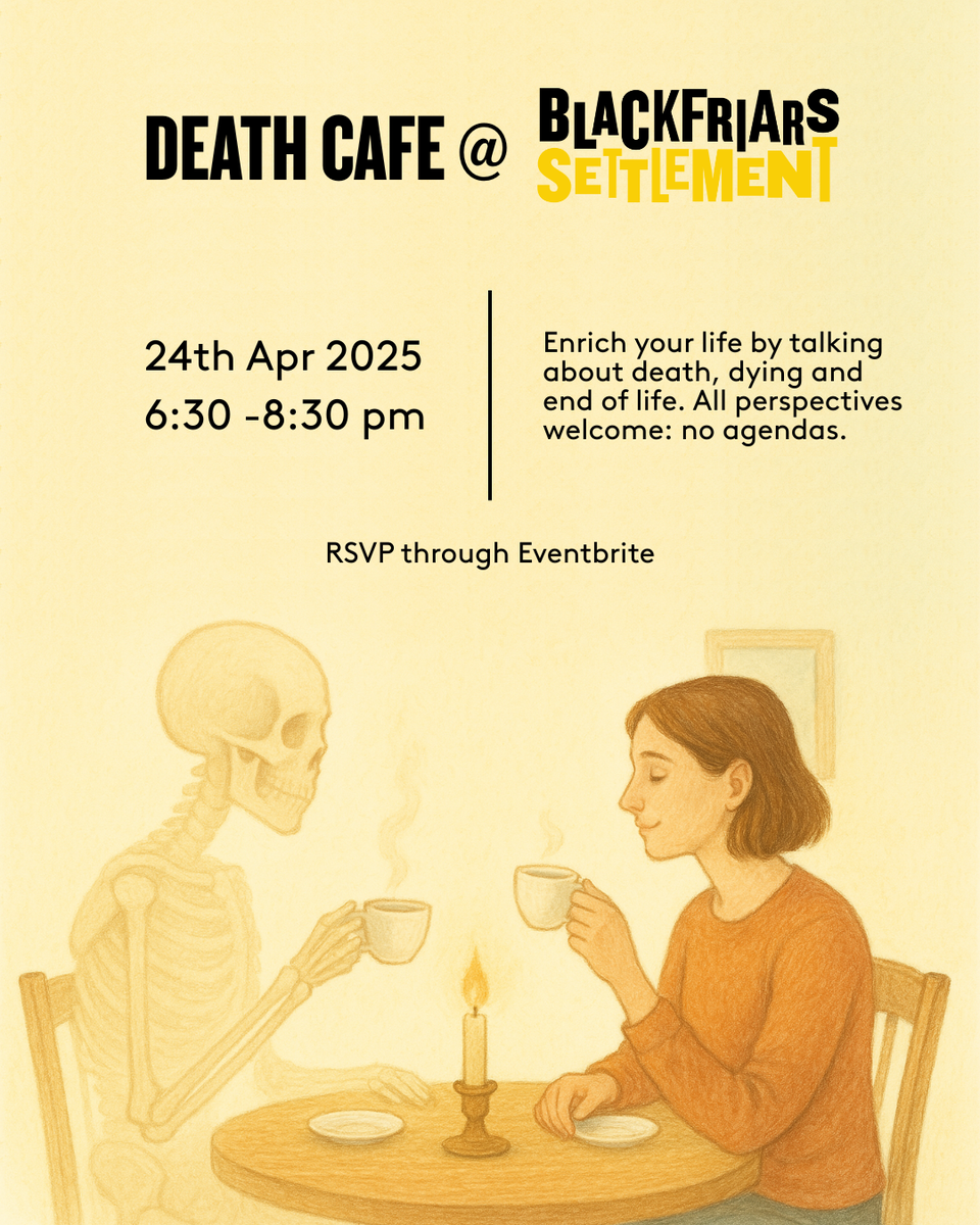 This Pop up Death Cafe takes place in Blackfriars Settlement, which has been supporting the local community in Southwark since 1887.