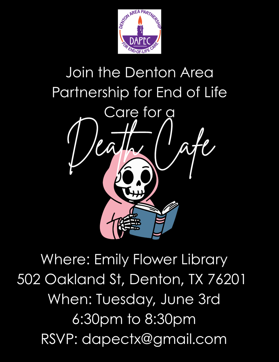 Denton Area Partnership for End of life Care (DAPEC) is a 501(c)(3) whose purpose is to provide community education and awareness about issues related to advance care planning and end-of-life care.
