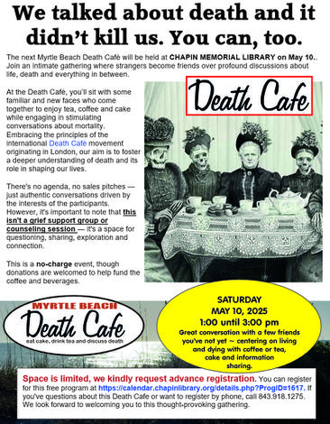 We’ll embrace the principles of the International DeathCafé movement that began in London, as we will try to foster a deeper understanding of death and its role in shaping our lives.