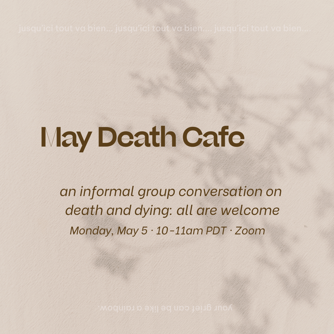 May Virtual Death Cafe is a space to gather with a group of friendly, earnest people to talk about death and dying. It's a beautiful opportunity to explore your questions, fears, and thoughts about death and loss that are often not welcome in other social contexts. Death shows up in many ways in our lives, not just end of life, and you're also welcome at this Death Cafe to explore the thematic and metaphorical ways that death is showing up for you -- through other forms of loss, transition, and grief.
