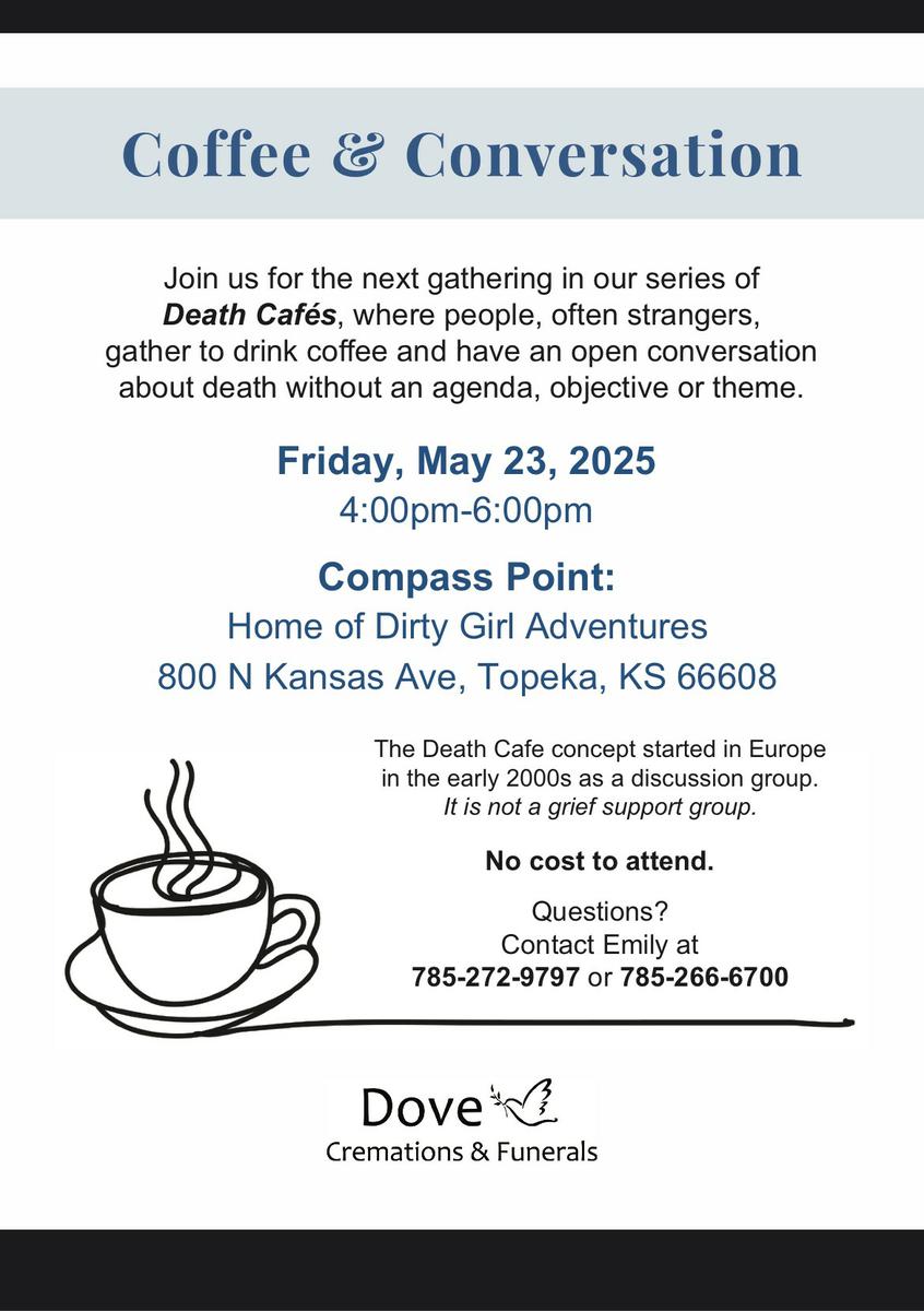 This commitment to helping others has inspired me to host a Death Cafe. I want to create a space where people can feel comfortable discussing death without pressure or discomfort. Partnering with Cafe Quetzal in Topeka, KS, I'm excited to provide a cozy, informal setting for these meaningful conversations. Let's come together to share stories, ask questions, and explore our thoughts on death over coffee.