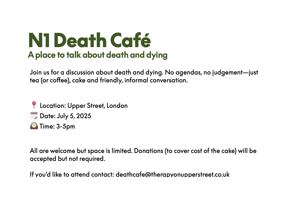 Join us for a discussion about death and dying. No agendas, no judgement—just tea (or coffee), cake and friendly, informal conversation.