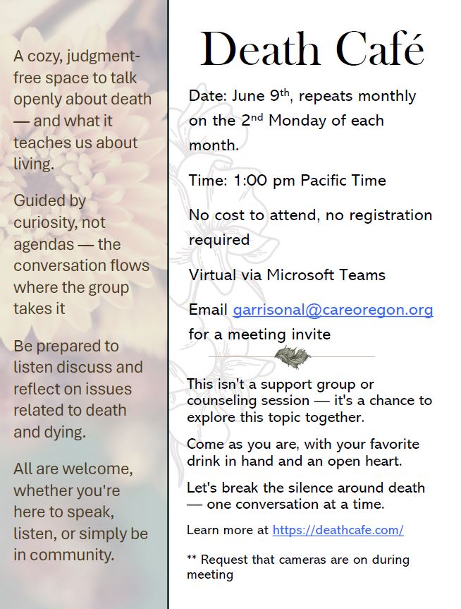 This is a free community event open to all. The intention is to create a relaxed and respectful space where people can explore thoughts, feelings, and questions about death—without judgment, advice-giving, or analysis. We aim to foster open conversation and deep listening, allowing whatever needs to surface to do so naturally. There’s no agenda or objective beyond connection and reflection.