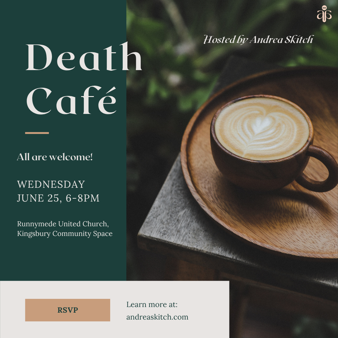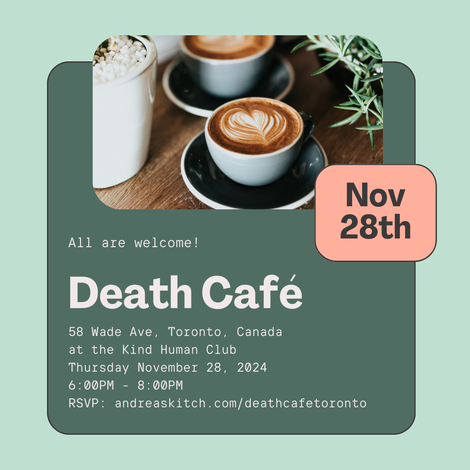 This Death Cafe is for everyone! It is being held at the beautiful Runnymede United Church, a community space near Bloor and Runnymede in Toronto, CA. Come and enjoy conversation, connection, in a warm, cozy space. Pls RSVP and bring a friend! See you there.