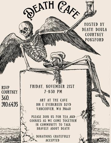 Sponsored and held at Art At The Cave in downtown Vancouver, Washington. Light refreshments will be served. This will be a monthly offering. Bring your curiosities, experiences, fears and an open mind as we bravely explore together the one true guarantee in life.
