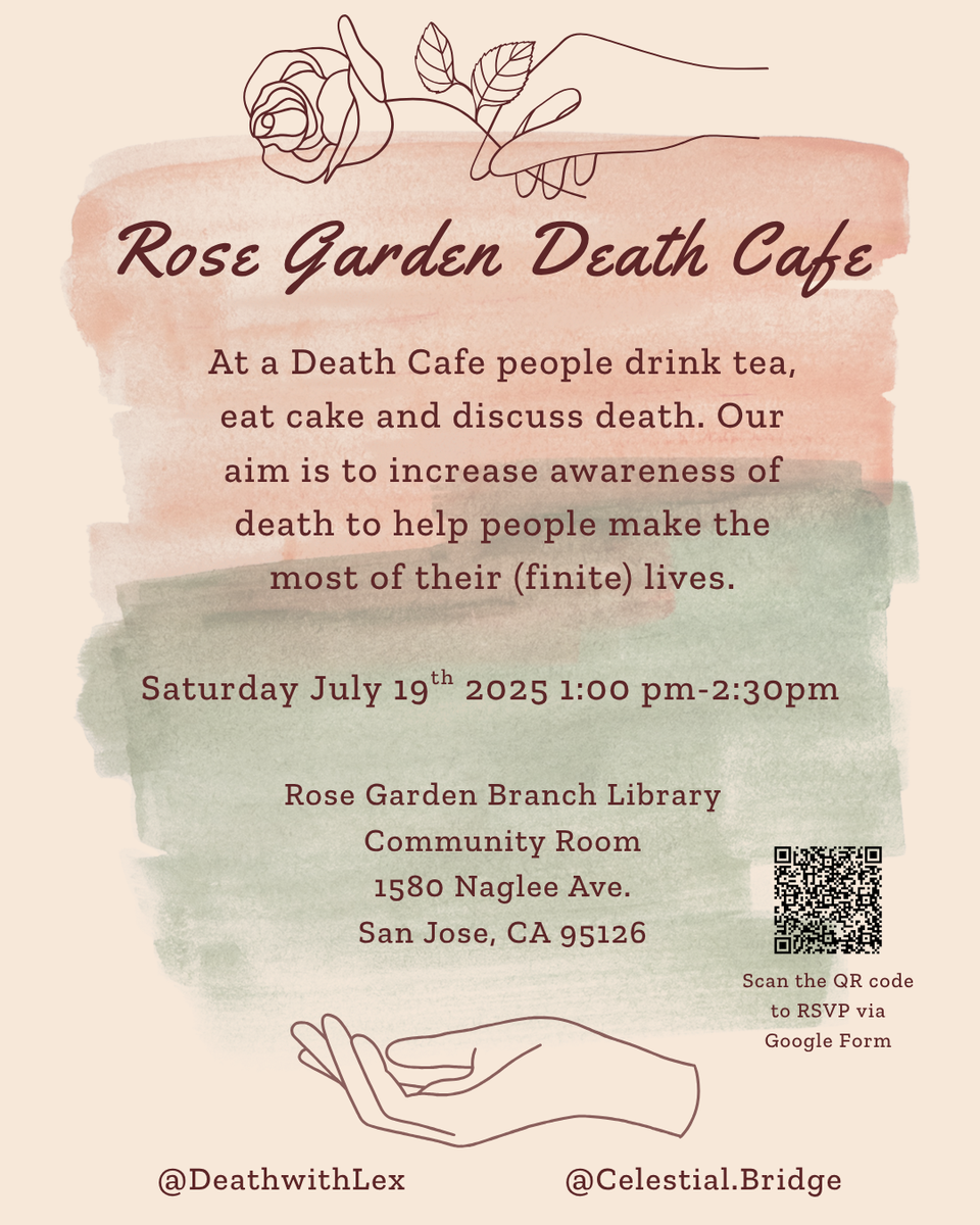 The Rose Garden Death Cafe is offered as a completely free event, in a respectful and confidential setting. There’s no intention to guide you toward any particular belief or action; just an invitation to explore, learn, and simply be present.