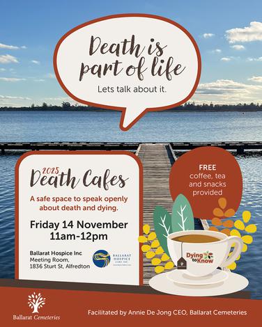 Death Cafes offer a relaxed, welcoming space for you to share thoughts, stories and questions about death over tea, coffee and snacks. They help you become more comfortable talking about death so you can go on to live your life to the fullest.