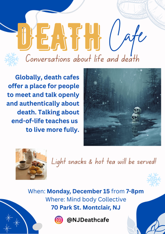 We are a roaming Death Cafe, so find on instagram @njdeathcafe for our monthly location.