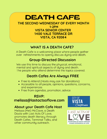 The Vista Senior Center supports Mel's mission to normalize discussions of dying, death, and whatever comes after. We are aligned in giving people the opportunity to socialize in person in a safe and supportive environment.
