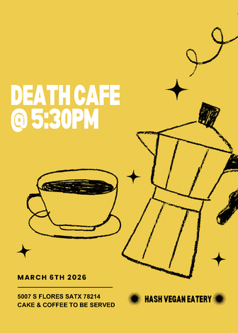 We are proud to be hosting this death cafe at Hash Vegan Eatery on San Antonio's South Side! The mission at Hash - Heal And Spread Healing, is to provide a safe space for everyone with a focus on delicious vegan comfort food and non-alcoholic drinks. As members of the recovery community, we strive to be an inviting option to the sober, sober curious, and everyone else. Cake at this event will be vegan.