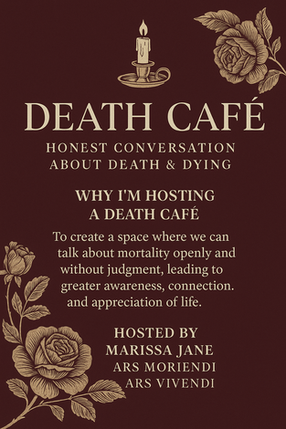 That’s why I’m honored to host this Death Café: a welcoming, nonjudgmental gathering where people of all backgrounds can come together to share thoughts, fears, experiences, and reflections about death and dying.