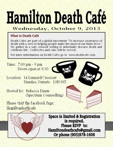 Oct 9th, 2013 will mark the date of the first Death Cafe in Hamilton! The plan is offer them on a regular bases in the area so that as many people as possible have the opportunity to attend and share in the conversation.