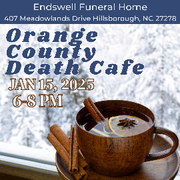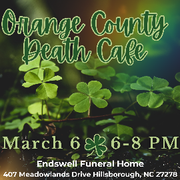 • 1st Thursday of the month, 6:00-8:00 p.m.: Orange County Death Café, 407 Meadowlands Dr., Hillsborough, facilitator TBD. Registration at https://endswellfuneralhome.com/news-and-events/