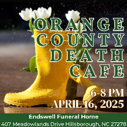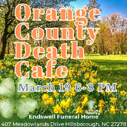 • 1st Thursday of the month, 6:00-8:00 p.m.: Orange County Death Café, Endswell FH, 407 Meadowlands Dr., Hillsborough, facilitator TBD. Registration at https://endswellfuneralhome.com/news-and-events/