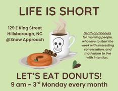 I hold a morning death cafe in Hillsborough, NC called Death and Donuts. It's hosted at The Snow Approach which is a critical and robust resource for folks experiencing brain change. I'd like to ensure people know there is a morning death cafe available for them in Hillsborough.